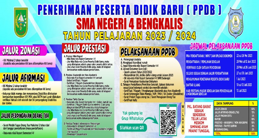 Informasi lebih lanjut, silahkan untuk bergabung ke grup WhatsApp dengan scan barcode yang telah di sediakan di bawah, atau mendatangi pos PPDB di SMA Negeri 4 Bengkalis.